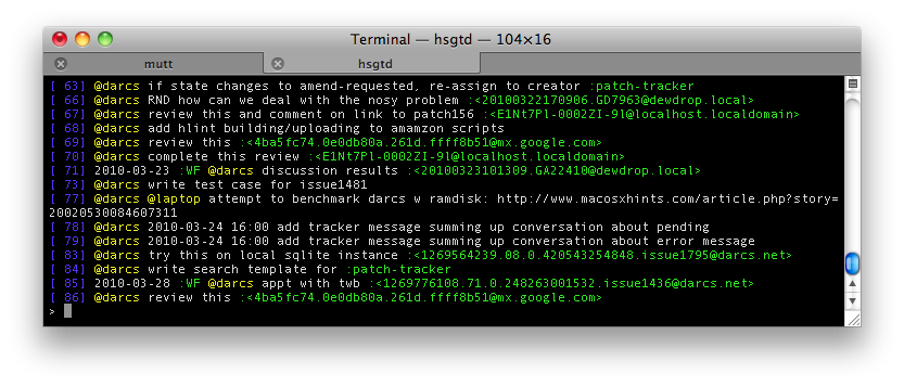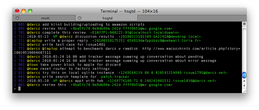 In this posting, we saw a way of extracting "next actions" from your mutt inbox and storing them in an hsgtd list. In a future posting, I hope to expand on this by exploring delegation (asking somebody else to act) and review (going over your actions and delegated items). Actually, the review was what initially motivated this blog posting. I'd finally worked out how to create a virtual mailbox of my hsgtd-tracked items and wanted to show it off. But that will have to wait as this post is long enough as it is.