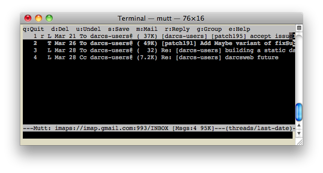 If you saw Merlin Mann's Inbox Zero talk, there are 5 "verbs" you can apply to an inbox item. Let's run through these. Clearly this is not a mail I want to [i] delete, and for a variety of reasons, it's not something I want to [ii] delegate, or to [iii] defer. Let's look at the email in mutt: